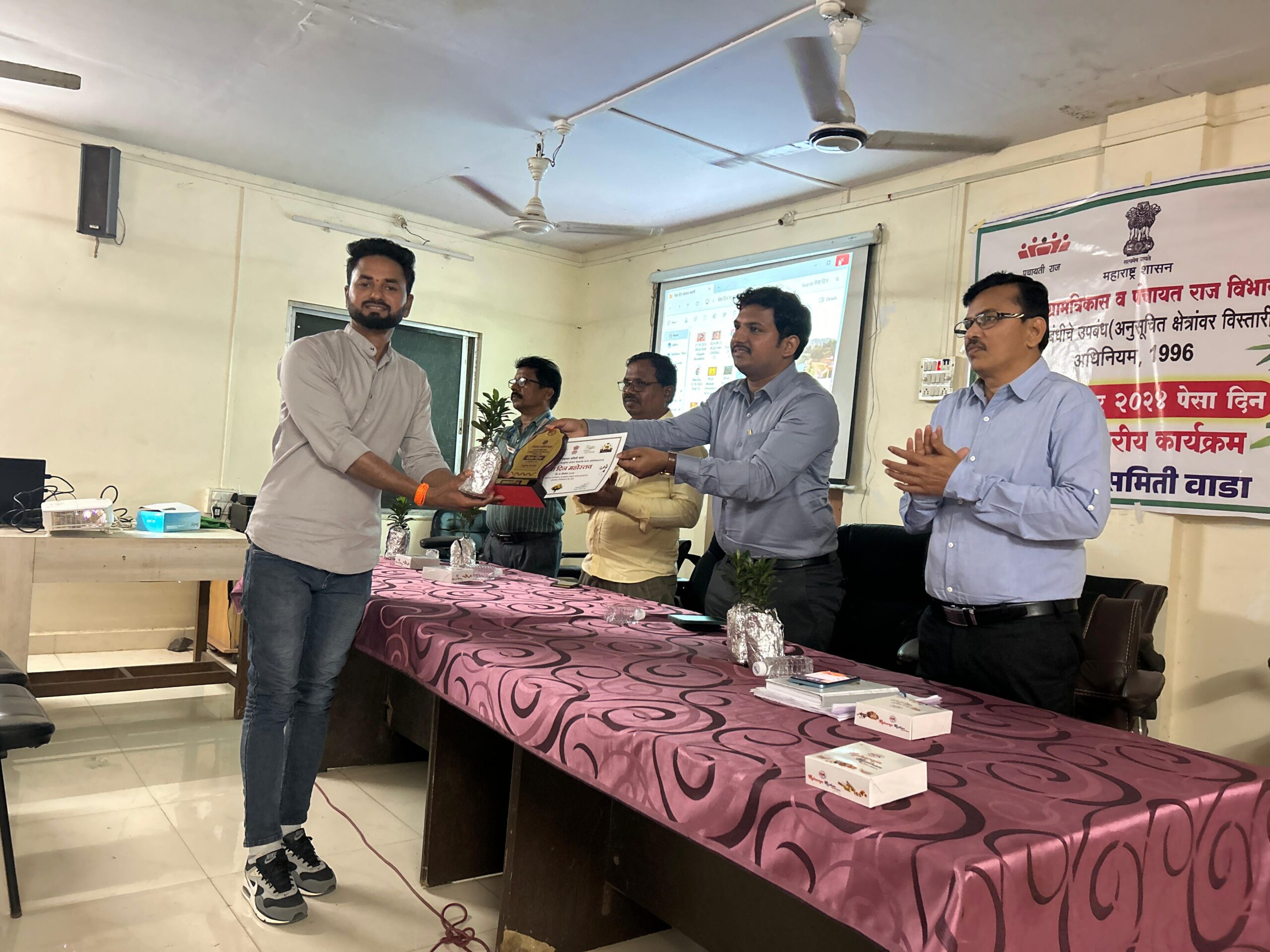 खानिवली ग्रामपंचायतीचे विद्यमान सरपंच भरत हजारे,हे निवडून आल्यापासून सतत नावीन्यपूर्ण उपक्रम राबवून ग्रामपंचायतीचे नाव महाराष्ट्रामध्ये नावारूपाला आणले आहे.गेल्या दोन वर्षापासून गावाचा शास्वत आणि पायाभूत विकास करण्यासाठी ते सतत प्रयत्न करत असतात.गेल्या दोन वर्षात गावात अनेक विकासकामे केली असून ग्रामपंचायतीला पुरस्कार मिळवून दिला आहे.महाराष्ट्र शासनाच्या वातावरणीय व पर्यावरणीय बदल विभागाचे माझी वसुंधरा अभियान ४.० मध्ये खानिवली ग्रामपंचायतीला कोंकण विभागाचे ५० लाखाचे प्रथम पारितोषिक मिळाले होते.आता ग्रामपंचायत राज्यस्तरावर स्पर्धा करत आहे.ग्रामपंचायतीमध्ये घनकचरा व्यवस्थापन करण्यासाठी प्लॅस्टिक बॉटल क्रशिंग मशीन असुन त्या माध्यमातून २ महिलांना रोजगार उपलब्ध करुन देण्यात आला आहे.गावातील तलावाचे अमृत सरोवरमध्ये रूपांतर केले असुन अतिशय सुंदर आणि दिखामदार बनवले आहे.गावात रोजगार हमी योजनेच्या माध्यमातून महिलांना दररोज रोजगार दिला जातो.भरत हजारे हे स्वतः यशदा पुणे या शासकीय संस्थेचे प्रविण प्रशिक्षक असुन त्यांच्या माध्यमातून महाराष्ट्रातील सरपंच यांना प्रशिक्षण देण्याचे काम केले जाते.पंचायत राज प्रशिक्षण संस्थेचेसुद्धा ते प्रशिक्षक आहेत.पेसा विषयाचे ते अभ्यासक असुन त्यांना पेसा कायद्याचा चांगला अभ्यास आहे.याची दखल घेऊन पंचायत समितीने यावर्षी पेसा दिनाच्या निमित्ताने सरपंच भरत हजारे यांना उत्कृष्ट सरपंच म्हणून पुरस्कार देण्यात आला.यावेळी गटविकास अधिकारी वैभव शिंदे,विस्तार अधिकारी वसंत अहिरे,विस्तार अधिकारी नितिन मोकाशी,कृषि विस्तार अधिकारी गायकवाड,तालुका पेसा समन्वयक महेश भोईर,तालुक्यातील सरपंच,पेसा मोबिलायझर उपस्थित होते.