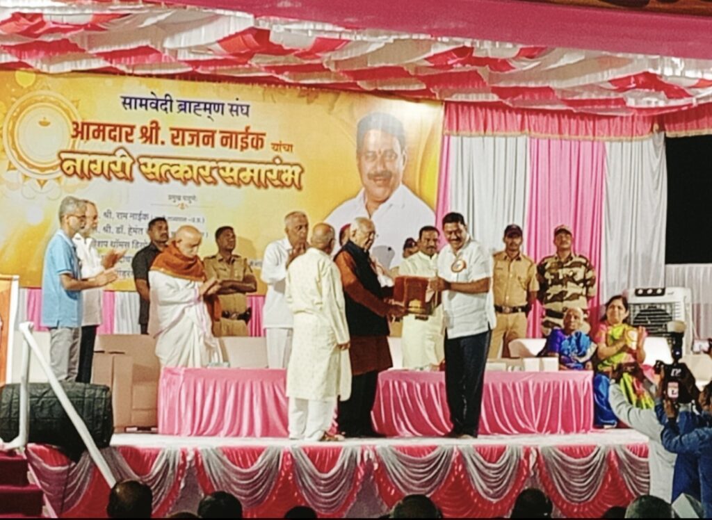 विरार – उमराळे येथे सामवेदी ब्राह्मण समाज संस्थेचे अध्यक्ष अनंत पाटील यांच्या अध्यक्षतेखाली झालेल्या,या कार्यक्रमात व्यासपीठावर खा.डॉ हेमंत सवरा,तत्कालीन ठाणे जिल्हा परिषदेचे माजी अध्यक्ष बबनशेठ नाईक,प्रल्हादाचार्य नागरहळी गुरुजी,बिशप थाॅमस डिसोजा आदी मान्यवर उपस्थित होते. राम नाईक आपल्या भाषणात पुढे म्हणाले,बालयोगी श्री सदानंद महाराज आश्रमास संरक्षण मिळवून देवून आस्था जपणे,सर्वधर्मिय सलोखा टिकवणे,सर्व समाजांना समान न्याय,आगरी-कोळी, आदिवासी समाज बांधवांचे हित जपणे,तालुक्याचा सर्वांगीण विकास करणे,यासाठी झटले पाहिजे.मी आता वानप्रस्थाश्रमाच्या स्थितीत पोहोचलो आहे,पण आपल्या पावलावर पाऊल टाकून आपला मुलगा कर्तृत्ववान झालेला पाहण्याचा आनंद खूप मोठा असतो.तीच अपेक्षा आ.राजन नाईक यांच्याकडून मला आहे.आदर्श आमदाराचा प्रवास सहज सोपा नसला तरी राजन नाईक तो सहज करतील,अशी अपेक्षा आहॆ. त्यांना माझ्या उदंड शुभेच्छा. खा.डॉ हेमंत सवरा यांनी आपल्या मनोगतात राजन नाईक,हे माझ्या मोठ्या भावासमान असल्याचे सांगून ते आमदार झाल्याचा मला खूप आनंद आहॆ.बबन शेठ नाईक यांनी आपल्या समाजाचे राजन नाईक प्रथम आमदार झाल्याचा आम्हाला आनंद तर आहे.सर्व समाज एकदिलाने त्याना सहकार्य करेल,अशी ग्वाही दिली.प्रल्हादाचार्या नागरहळी गुरूजी,बिशप थाॅमस डिसोजा व अनेक सामाजिक संघटनांच्या प्रतिनिधींची यावेळी समयोचीत भाषणे झाली.कार्यक्रमाचे प्रास्ताविक अनंत पाटील यांनी केले. सुत्रसंचलन सत्यवान पाटील तर आभार प्रदर्शन राजेश नाईक यांनी केले.
