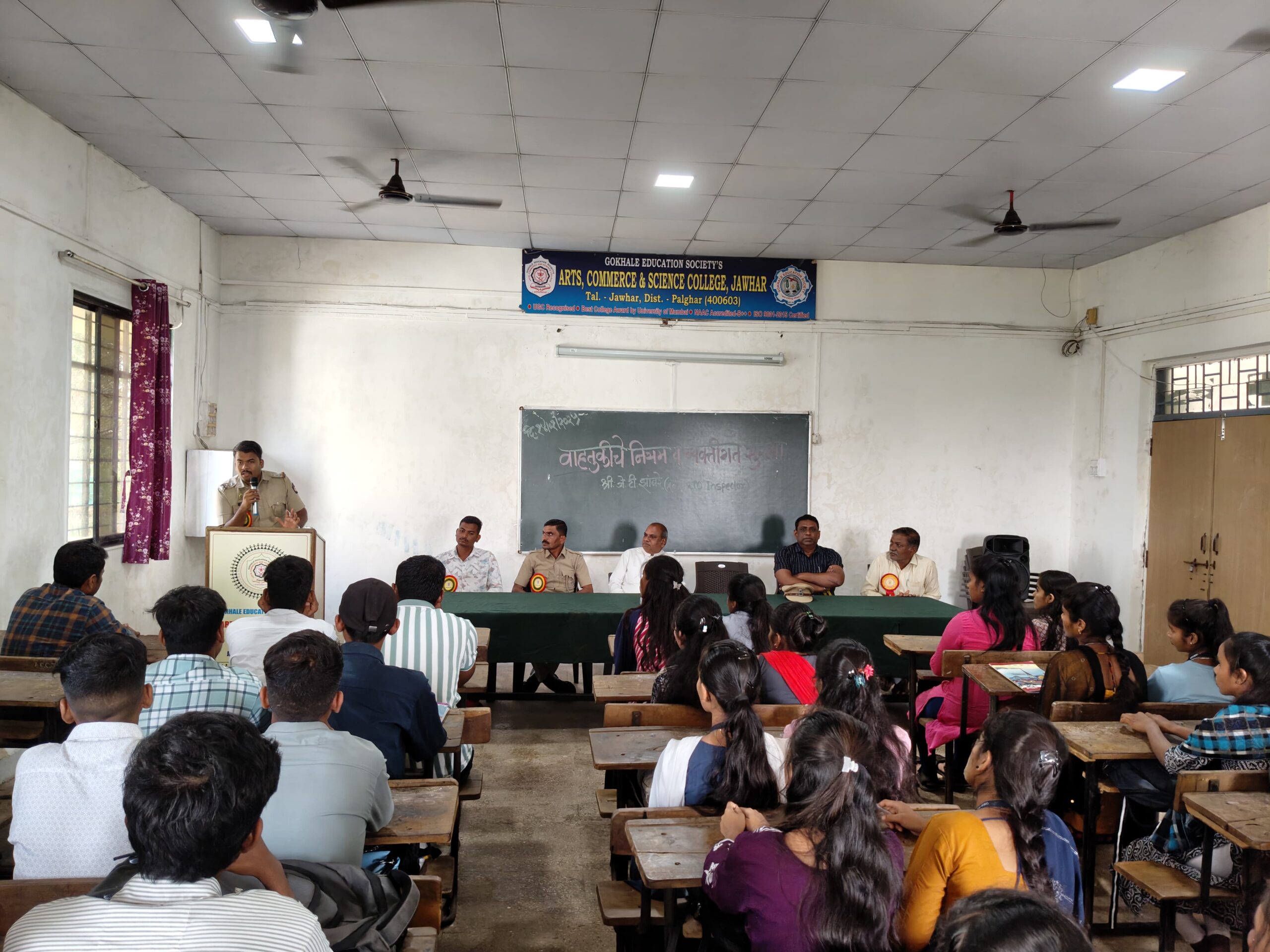 गोखले एज्युकेशन सोसायटीच्या कला,वाणिज्य आणि विज्ञान महाविद्यालयात विद्यार्थ्यांसाठी ” वाहतुकीचे नियम व सुरक्षा,” या विषयावर विशेष कार्यक्रमाचे आयोजन करण्यात आले होते.या कार्यक्रमास वसई विभागाचे सहा.आरटीओ,जे.टी.झांबरे प्रमुख पाहुणे म्हणून उपस्थित होते,तर कार्यक्रमाचे अध्यक्षस्थान महाविद्यालयाचे प्राचार्य डॉ. एम. आर. मेश्राम यांनी भूषवले.जे.टी.झांबरे यांनी विद्यार्थ्यांना वाहतुकीचे नियमांचे महत्त्व आणि रस्त्यावरील सुरक्षितता याविषयी परिपूर्ण माहिती दिली.त्यानी अपघात टाळण्यासाठी नियमांचे पालन कसे करावे,याविषयी विद्यार्थ्यांना सांगितले.प्राचार्य डॉ.एम.आर.मेश्राम यांनी आपल्या अध्यक्षीय भाषणात विविध अपघात आणि ते टाळण्यासाठी करावयाच्या उपाययोजनांवर आपली मते मांडली.कार्यक्रमाचे आभार प्रदर्शन महाविद्यालयाचे उपप्राचार्य डॉ.सुरेंद्र कदम यांनी केले.त्यांनी विद्यार्थ्यांना वाहतूक सुरक्षेच्या विविध बाबींबद्दल अधिक जागरूकतेचे आवाहन केले.या कार्यक्रमाचे सूत्रसंचालन प्रा. अभिजीत बांबरे यांनी केले. तर प्रा.मंगेश भले यांनी कार्यक्रम यशस्वी करण्यासाठी सहकार्य केले.विद्यार्थ्यांच्या प्रश्नोत्तरांद्वारे वाहतूक सुरक्षेच्या वेगवेगळ्या पैलूंवर चर्चा झाली.सुमारे २०० विद्यार्थी कार्यक्रमात उत्स्फूर्त सहभागी झाले आणि या मार्गदर्शन सत्राचा लाभ घेतला.हा कार्यक्रम विद्यार्थ्यांमध्ये वाहतुकीचे नियम पाळण्याविषयी जागरूकता निर्माण करण्यात यशस्वी ठरला.