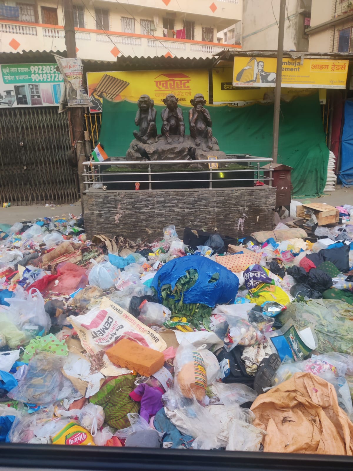 नालासोपारा पुर्व नगिनदासपाडा येथे पालिकेच्या माध्यमातून सुशोभीकरण केलेल्या चौकात गांधीजींच्या तीन प्रसिद्ध माकडांची शिल्पे बसवण्यात आली आहेत.स्वच्छता विभागाकडून परीसरात कचराकुंड्या ठेवलेल्या नसल्यामुळे येथे नागरीकांकडून प्लॅस्टीक,चप्पल,बाटल्या तसेच इतर टाकाऊ कचरा बिनधास्तपणे उघड्यावर टाकला जात आहॆ.त्यामुळे या चौकाची अक्षरशा दुर्दशा झाली आहे.रोजच्या रोज कचरा उचलला जात नसल्यामुळे रात्रीच्या वेळी भटक्या श्वानांमुळे हा कचरा सर्वत्र विखुरला जात असतो.सकाळच्या वेळी मॉर्निंग वाॕकला जाणा-या नागरीकांना या कच-यामुळे नाक मुठीत धरून चालावे लागते.स्वच्छ भारत अभियान किंवा इतर महत्वाचा दिवस असेल तेव्हाच शहर स्वच्छ करणार का ? असा सवाल आता नागरीक करीत आहेत.हा कचरा रोज उचलण्यात यावा,कचरा कुंड्या ठेवण्यात याव्या,तसेच कचरा सार्वजनिक ठिकाणी फेकण्यात येऊ नये,म्हणून परीसरात कॕमेरे बसविण्यात यावेत,मोकाट श्वानांचा बंदोबस्त करण्यात यावा,अशा विविध मागण्या नागरीकांकडून करण्यात येत आहेत.