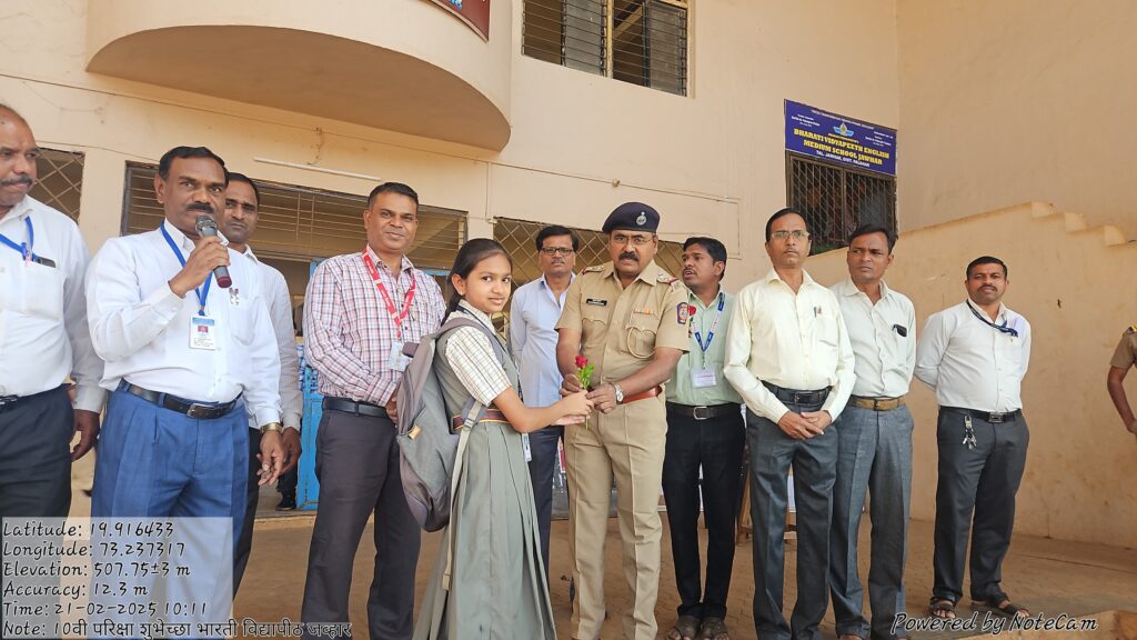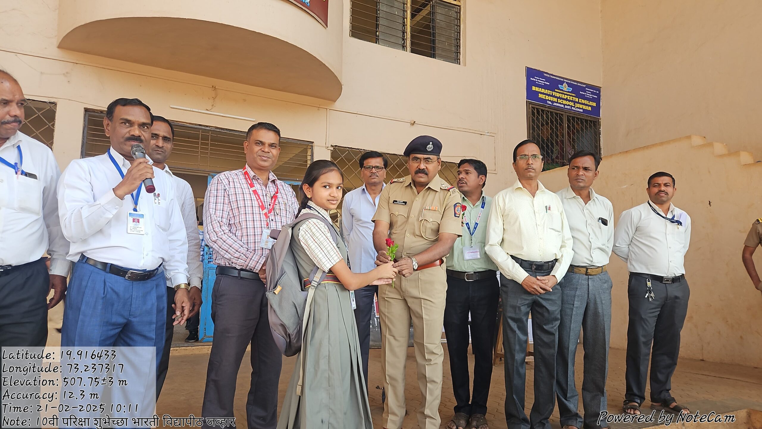 भारती विद्यापीठ प्रशाला व ज्युनिअर कॉलेज, जव्हार येथे १० वीच्या विद्यार्थ्यांचे गुलाब पुष्प देऊन स्वागत करण्यात आले आणि पहिल्या पेपरसाठी शुभेच्छा देण्यात आल्या.याप्रसंगी विविध मान्यवर उपस्थित होते.