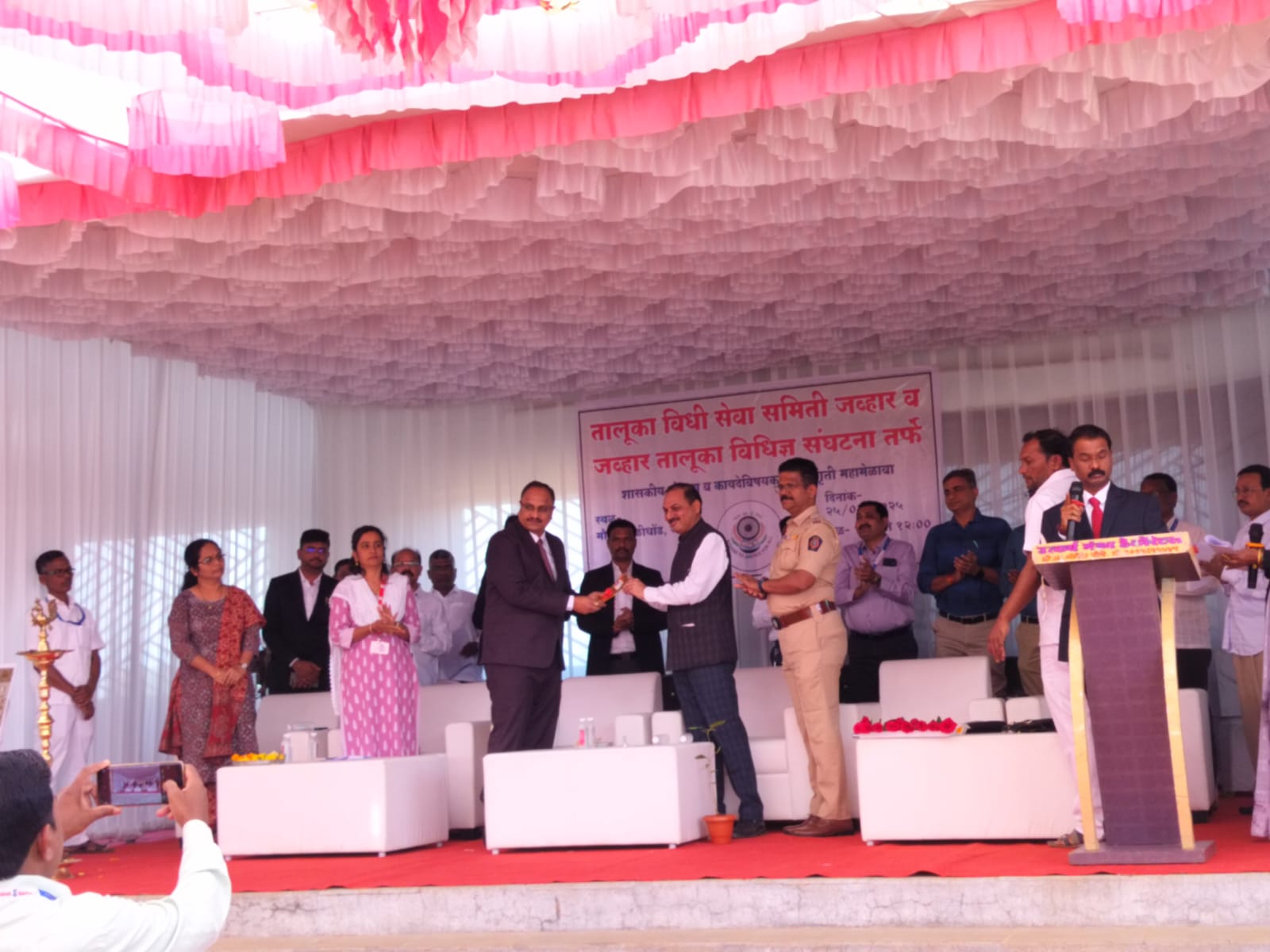 तालुका विधी सेवा समिती जव्हार व जव्हार तालुका विधिज्ञ संघटना यांच्या संयुक्त विद्यमाने शासकीय योजना व कायदेविषयक जनजागृती मेळावा आज जुनी जव्हार ग्रामपंचायतमधील काळीधोंड येथे संपन्न झाला.कार्यक्रमाचे उद्घाटन उपस्थित मान्यवरांच्या हस्ते दीपप्रज्वलन व संविधान उद्देशिकेचे वाचन करून करण्यात आले.या कार्यक्रमाच्या अध्यक्षस्थानी अभिजित ना.गायकवाड दिवाणी न्यायाधीश जव्हार होते,तर प्रमुख अतिथी म्हणून भाऊसाहेब फटांगरे अप्पर जिल्हाधिकारी पालघर मुख्यालय जव्हार,गणपतराव पिंगळे,उपविभागीय पोलीस अधिकारी जव्हार, लता धोत्रे तहसीलदार जव्हार, मूयर चव्हाण तहसीलदार मोखाडा, चारूशीला पवार तहसीलदार विक्रमगड,दीपक टिके सहाय्यक प्रकल्प अधिकारी जव्हार,महादेव राऊत वनपरिक्षेत्र अधिकारी,जव्हार मधुकर गवळी सहाय्यक गटविकास अधिकारी, मोखाडा निलेश भोये सरपंच जुनीजव्हार,श्रावण खरपडे माजी जि.प.सदस्य,तसेच डॉ.किरण पाटील,अतिरिक्त जिल्हा आरोग्य अधिकारी व वैद्यकीय अधिकारी जामसर, जयराम हरी आढळ तालुका कृषी अधिकारी जव्हार, उज्वला कोकणे जिल्हा अग्रणी बँक प्रतिनिधी,विधीज्ञ संघटनेचे पदाधिकारी व सदस्य इ.मान्यवर उपस्थित होते.