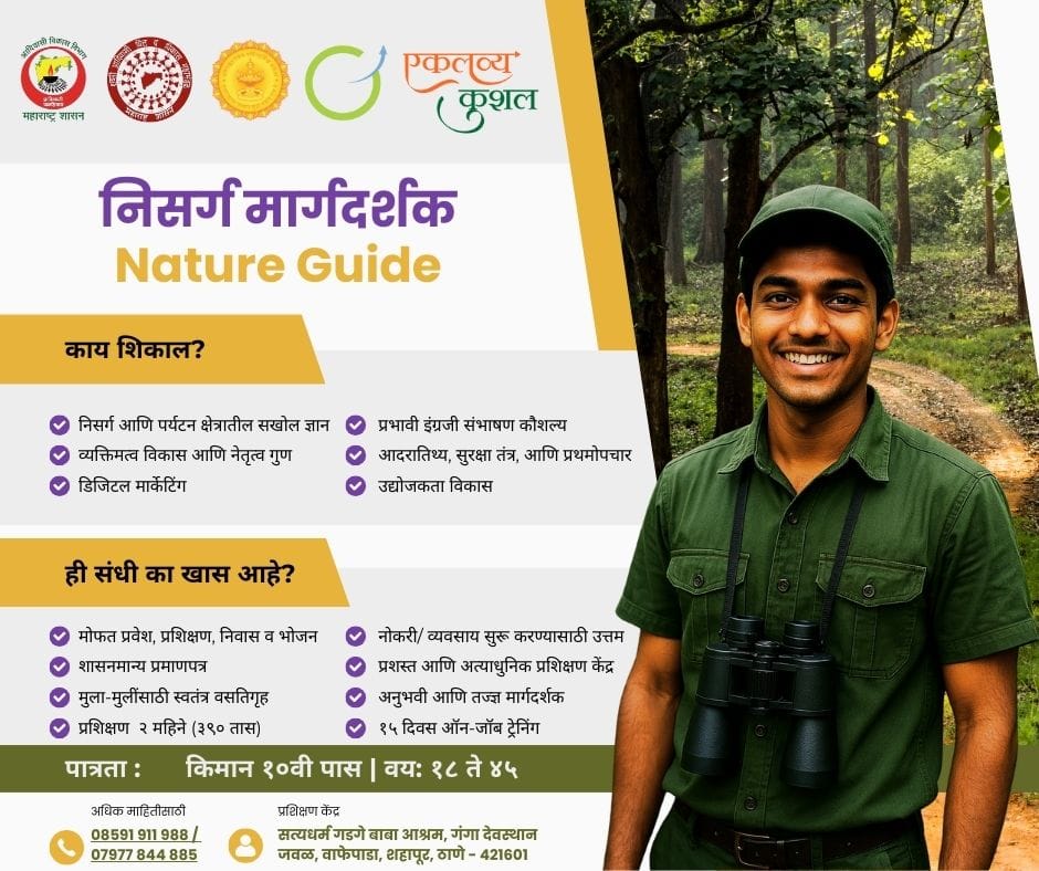 यासाठी पात्रता पुढीलप्रमाणे आहे,शिक्षण किमान १० वी पास, वय १८ ते ४५ वर्षे,प्रशिक्षण कालावधी २ महिने ( ३९० तास ), ४० दिवस प्रशिक्षण + १५ दिवस ऑन-जॉब ट्रेनिंग असणार आहे.प्रशिक्षणात तुम्हाला निसर्ग आणि पर्यटन क्षेत्रातील सखोल ज्ञान,प्रभावी इंग्रजी संभाषण कौशल्य,व्यक्तिमत्व आणि नेतृत्व विकास, आदरातिथ्य,सुरक्षा तंत्र, आणि प्रथमोपचार,डिजिटल मार्केटिंग आणि उद्योजकता विकास शिकण्यास मिळणार आहे.हे प्रशिक्षण गौशिक टेक्नॉलॉजीस कौशल्य विकास संस्था,सत्यधर्म गडगे बाबा आश्रम,गंगा देवस्थान मागे, वाफेपाडा,शहापूर,जि.ठाणे संपर्क क्र. 8591 911 988/7977844885 या नंबरवर करावा.नोंदणीसाठी https://docs.google.com/forms/d/e/1FAIpQLSdpWTwVGH0KlNMCC0DIXb1A4EXUfNGBIjEGqkXZJObRi68KoQ/viewform?usp=header येथे माहिती सादर करावी.जास्तीत जास्त पात्र व इच्छुक विद्यार्थ्यांनी सदर योननेचा लाभ घ्यावा,असे आवाहन आयुक्त,आदिवासी विकास आयुक्तालय,नाशिक यांनी केले आहे.