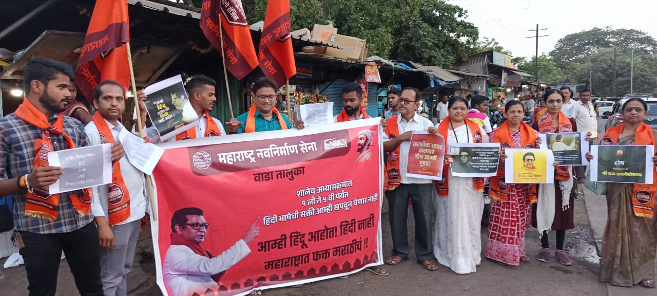 काल वाडा शहरात बस स्थानकासमोर महाराष्ट्र नवनिर्माण सेना वाडा तालुका अध्यक्ष कांतिकुमार ठाकरे यांच्या नेतृत्वाखाली जोरदार निदर्शने केली. यावेळी हिंदी सक्तीची पत्रके जाळण्यात आली.
