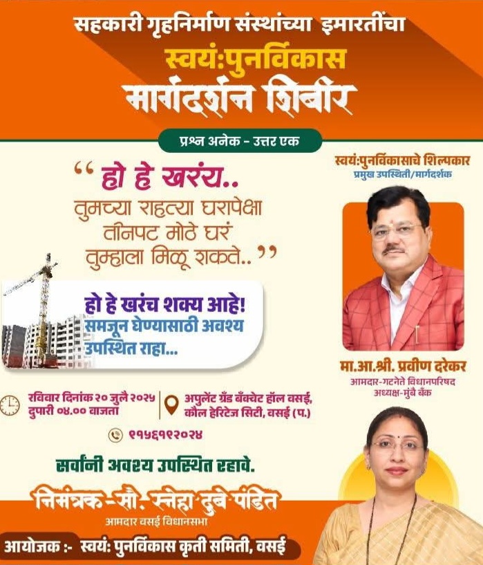 वसई विरार भागात पुनर्विकासाचे आता वारे वाहू लागले आहेत,याविषयी जनतेला माहिती मिळावी,यासाठी पुनर्विकास समितीतर्फे ” स्वयं:पुनर्विकास मार्गदर्शन शिबिराचे आयोजन करण्यात आले आहे.वसईत होणाऱ्या या मार्गदर्शन शिबिराच्या निमंत्रकपदी वसईच्या आ.स्नेहा दुबे या आहेत.