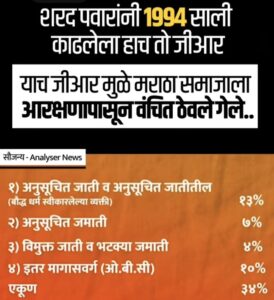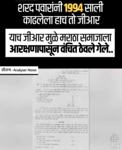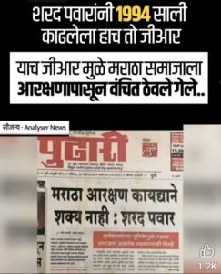 काढलेल्या एका जीआर मुळे मराठा समाज आरक्षणापासून वंचित राहिला.त्यावेळी शरद पवार यांनी मराठा आरक्षण कायद्याने शक्य नाही,असे वारंवार सांगत असत,आज तेच पवार,आरक्षण मिळाले पाहिजे,म्हणून जरांगे पाटलांना बळ देत आहेत.ज्यावेळी ते सत्तेत होते,तेव्हा ते अशाप्रकारचे आरक्षण देणे,शक्य नाही, असे तुणतुणे वाजवत होते.आज मात्र मराठ्यांना आरक्षण मिळाले पाहिजे,असा आग्रह धरत आहेत.जरांगे पाटील हे पवारांवर कितीही टीका करत असले तरी त्यांना पवार यांच्याकडून बऱ्यापैकी रसद पुरवण्यात येत होती,हे आता लपून राहिलेले नाही.दुसरीकडे राज्यात ओबीसी समाजाचे प्राबल्य लक्षात घेऊन मुख्यमंत्री फडणवीस यांनी. या समाजाच्या नेत्यांना फूस लावण्याचे धोरण अवलंबले.ओबीसींचे नेते छगन भुजबळ यांना त्यांनी या प्रश्नी हाताशी धरले असून भुजबळ यांनी सध्या राज्यभरात रान उठवण्यास सुरुवात केली